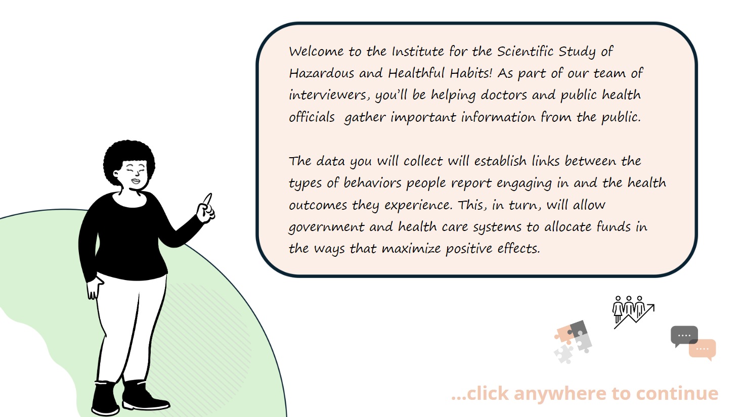 I created this sample project to demonstrate a learning solution directed at employees in one of my previous roles: telephone interviewers responsible for carrying out interviews to conduct public health research. Interviewers needed to both ensure that a high percentage of selected respondents completed the survey questionnaire, and conduct the survey in a consistent manner across all calls. The existing training model relied on a short verbal orientation and periodic feedback after live calls. This meant that interviewers might complete several calls before receiving important information about how to handle situations that might arise during interviews. The eLearning module solves the problem by presenting a range of scenarios for employees to think through before making live calls. Learning Objectives: 1) Understand the broad aims of the scientific survey; 2) Apply principles to maximize survey completion rates; 3) Apply principles to ensure consistency of delivery of the survey instrument in all cases. |